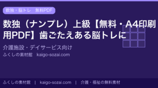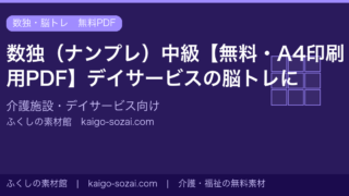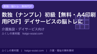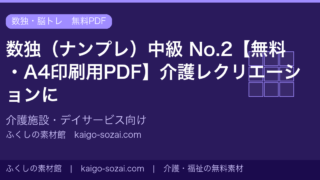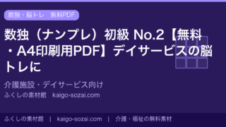 ナンプレ(数独)を無料配布。A4サイズのPDFをダウンロードして印刷するだけ。介護施設・デイサービスの脳トレやレクリエーションにご活用ください。