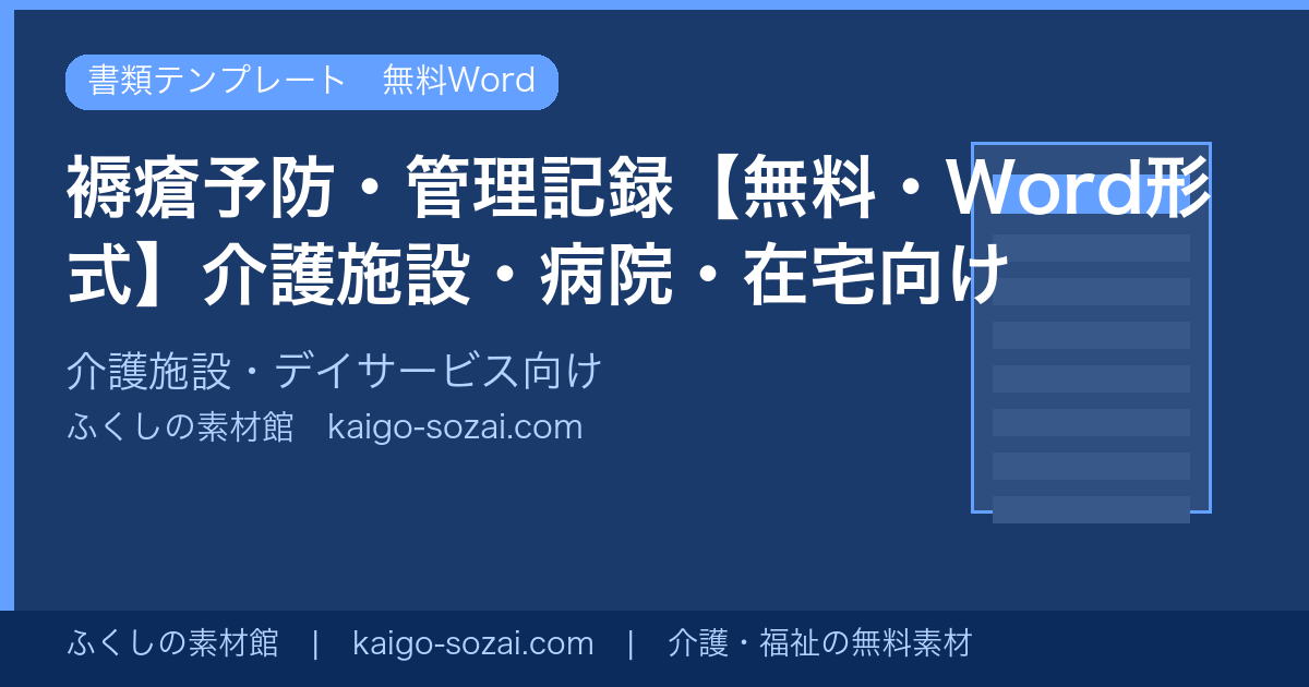 介護施設・病院・在宅ケアで使用する褥瘡予防・管理記録のテンプレートです。発生リスクの評価から処置記録・経過観察まで対応しています。