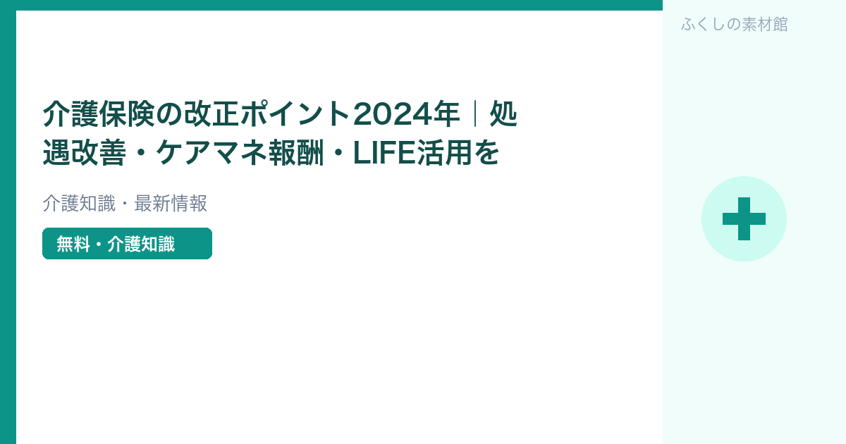 2024年(令和6年)4月の介護報酬改定では、介護職員の処遇改善・科学的介護の推進・ケアマネジメントの質向上などが盛り込まれました。