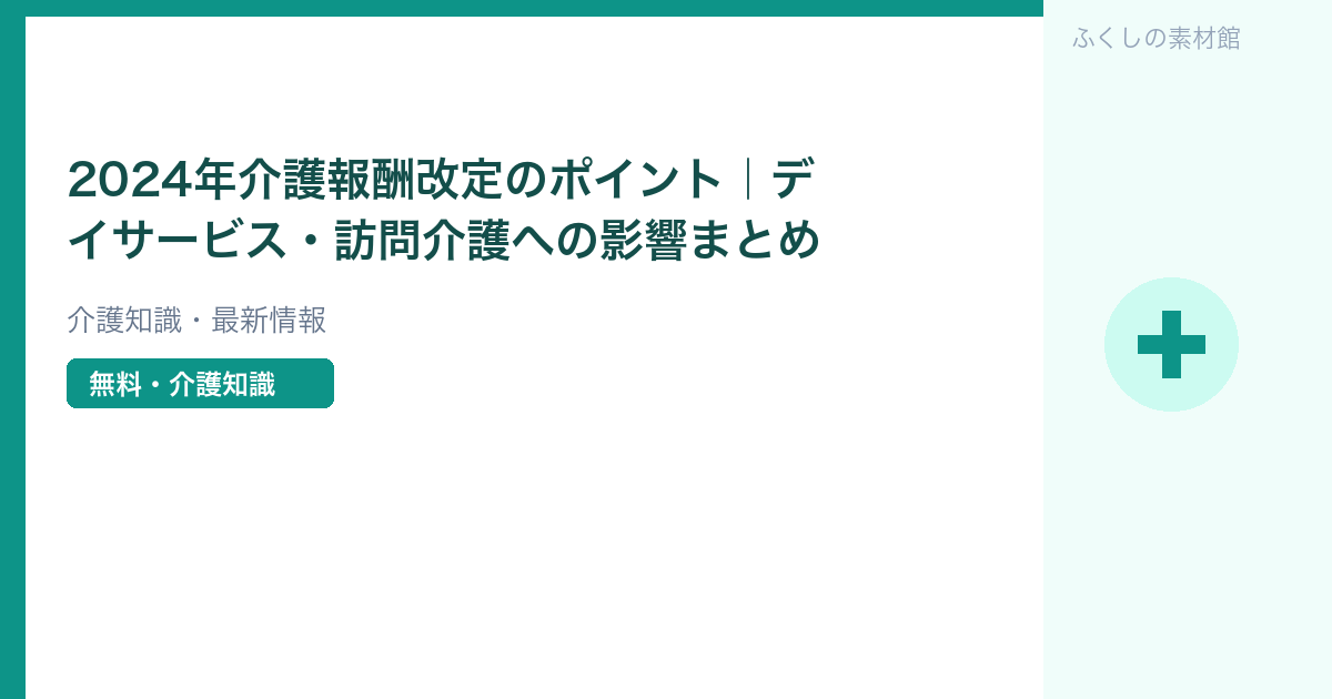 2024年4月に実施された介護報酬改定は、全体で+1.59%のプラス改定となりました。物価高騰・人件費上昇への対応と、介護職員の処遇改善が主な柱です。各サービスへの影響を整理します。