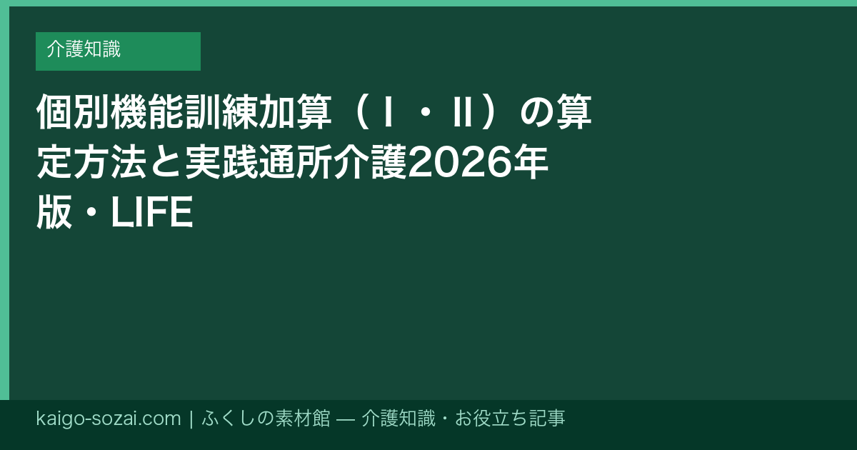 通所介護(デイサービス)で多くの事業所が算定を狙う「個別機能訓練加算」は、2024年度改定でⅠ(イ)(ロ)とⅡの構成が整理されました。2026年度も基本的な構造は維持されており、機能訓練指導員の配置・個別プログラムの作成・LIFEへのデータ提出が算定の要となります。