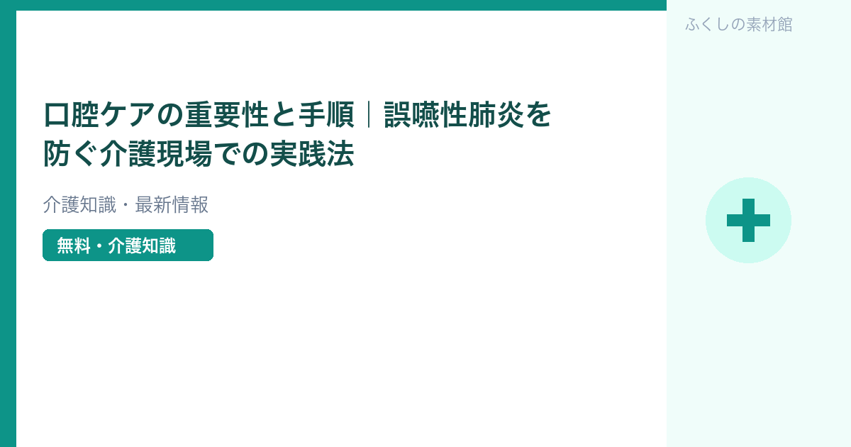 口腔ケアは「歯磨き」だけでなく、誤嚥性肺炎の予防・認知症予防・QOL向上に直結する重要なケアです。介護現場では毎食後の口腔ケアを習慣化しましょう。