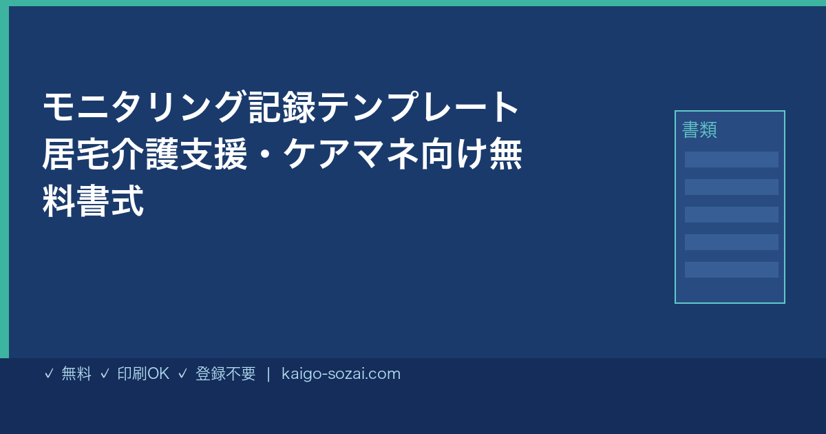 モニタリング記録は実地指導で必ず確認される書類です。「訪問したが内容が薄い」記録よりも、本人・家族の生の声と具体的な観察内容を記載した記録の方が質の高いケアマネジメントの証明になります。当サイトの書類テンプレートで業務の効率化にお役立てください。