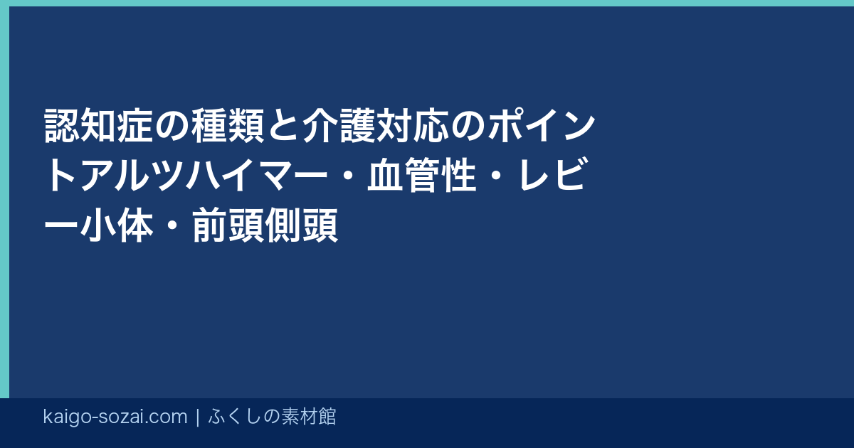 アルツハイマー型認知症は最も多く、緩やかに進行するのが特徴です。初期は「物忘れ」から始まりますが、本人は「忘れた」という記憶自体がないため、指摘されても理解できず混乱することがあります。介護者が「なぜ覚えていないの?」と責めることは厳禁です。