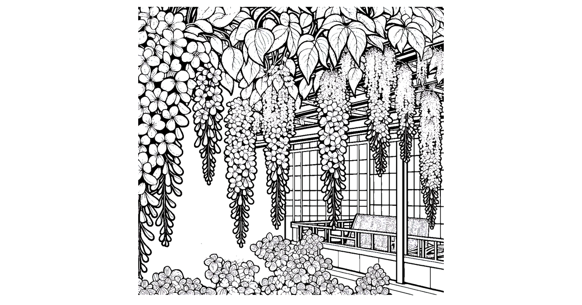 紫・薄紫・白・ピンクのグラデーションで塗ると藤棚の美しさが表現できます。花房の上部を濃く下部を淡く塗ることで自然な立体感が出ます。葉は黄緑〜緑へのグラデーションがおすすめです。色鉛筆で軽く重ね塗りすると、柔らかな藤の質感が表現できます。