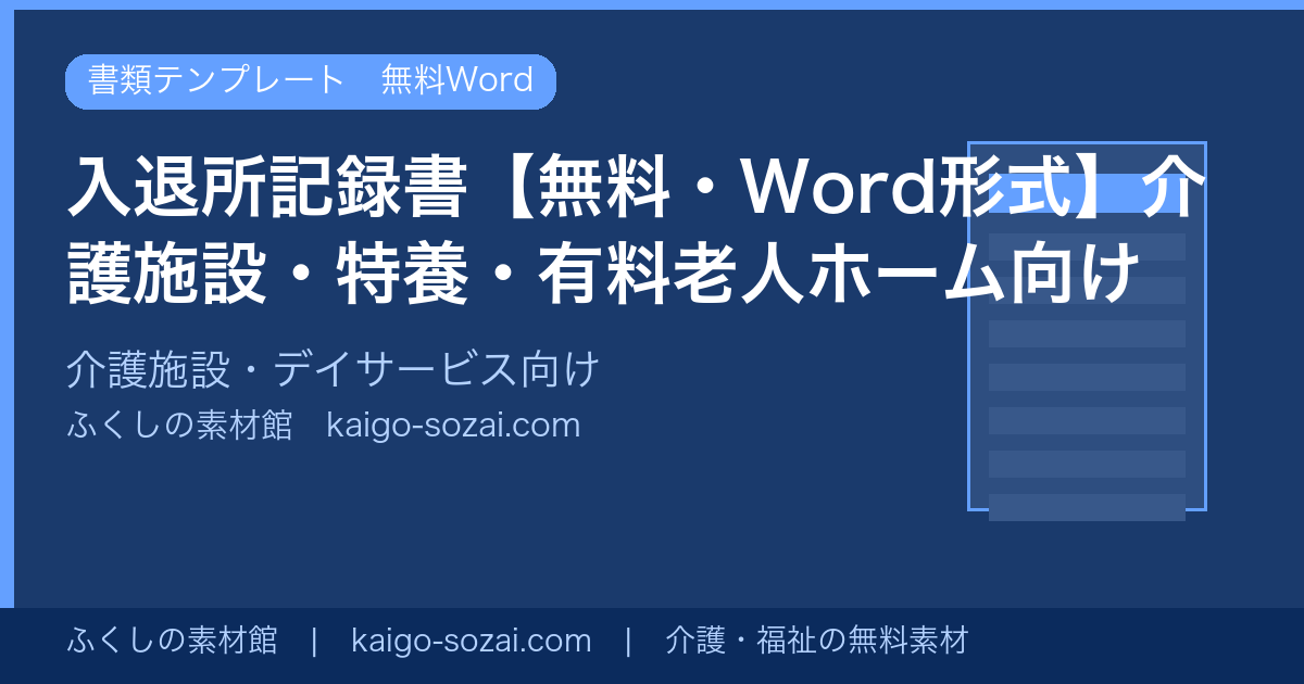介護施設の入所・退所時に作成する入退所記録書のテンプレートです。入所時の情報収集から退所後の引き継ぎまで、一貫した記録管理に活用できます。