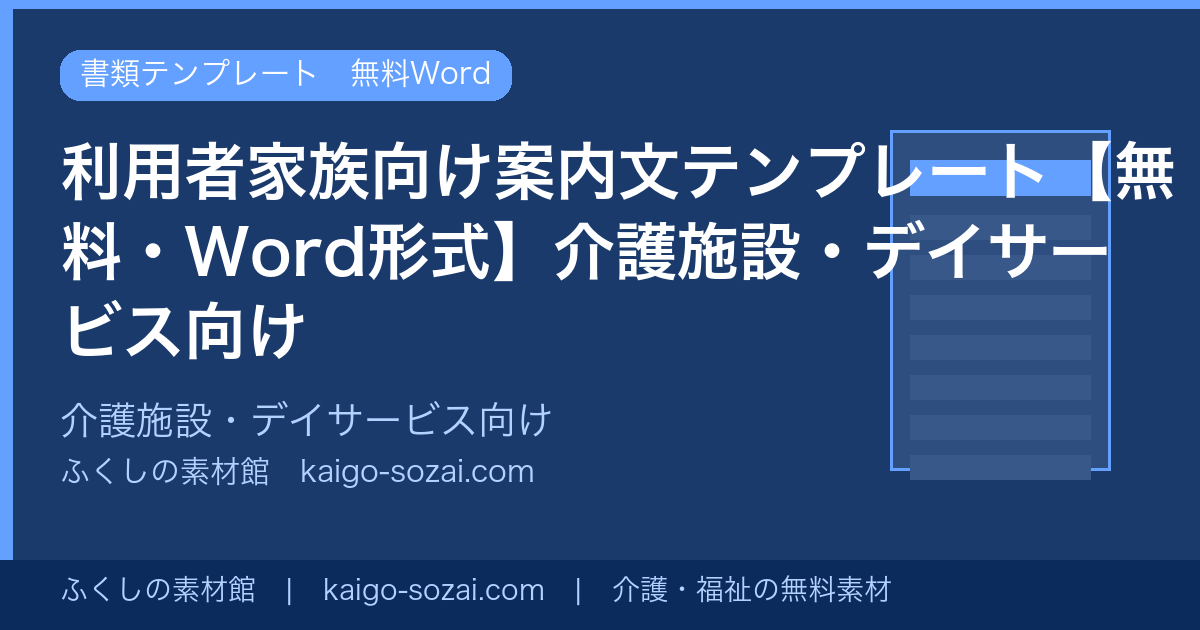 介護施設・デイサービスですぐに使える利用者家族向け案内文のテンプレートを無料配布しています。Word形式(.docx)とPDF形式でダウンロードできます。