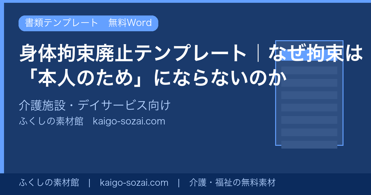 身体拘束廃止は「できない理由」を探すのではなく、「どうすればできるか」を考える姿勢から始まります。一人ひとりの状態に合った代替ケアを、チームで考えていきましょう。
