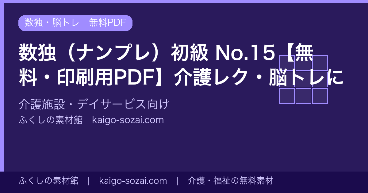 数独(ナンプレ)は数字を使ったパズルですが、計算は不要のため算数が苦手な方にも取り組んでいただけます。空白マスに1〜9の数字を埋めるシンプルなルールで、「論理的思考力」「集中力」「記憶力」を同時に鍛えられる脳トレとして介護現場で広く活用されています。個人で取り組む時間としてだけでなく、グループで相談しながら解くコミュニケーションの場としても活用できます。A4サイズのPDFを印刷してラミネート加工すれば、繰り返し使えるカードに変身します。難易度に合わせて初級・中級・上級を使い分けることで、利用者様の意欲を保ちながらレベルアップを楽しんでいただけます。