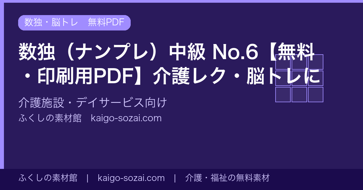 数独(ナンプレ)中級 No.6の問題です。基本的なルールを理解した方向けの、程よい難しさの問題です。空白のマスに1〜9の数字を入れて完成させてください。介護施設・デイサービスの脳トレ・レクリエーションにご活用ください。
