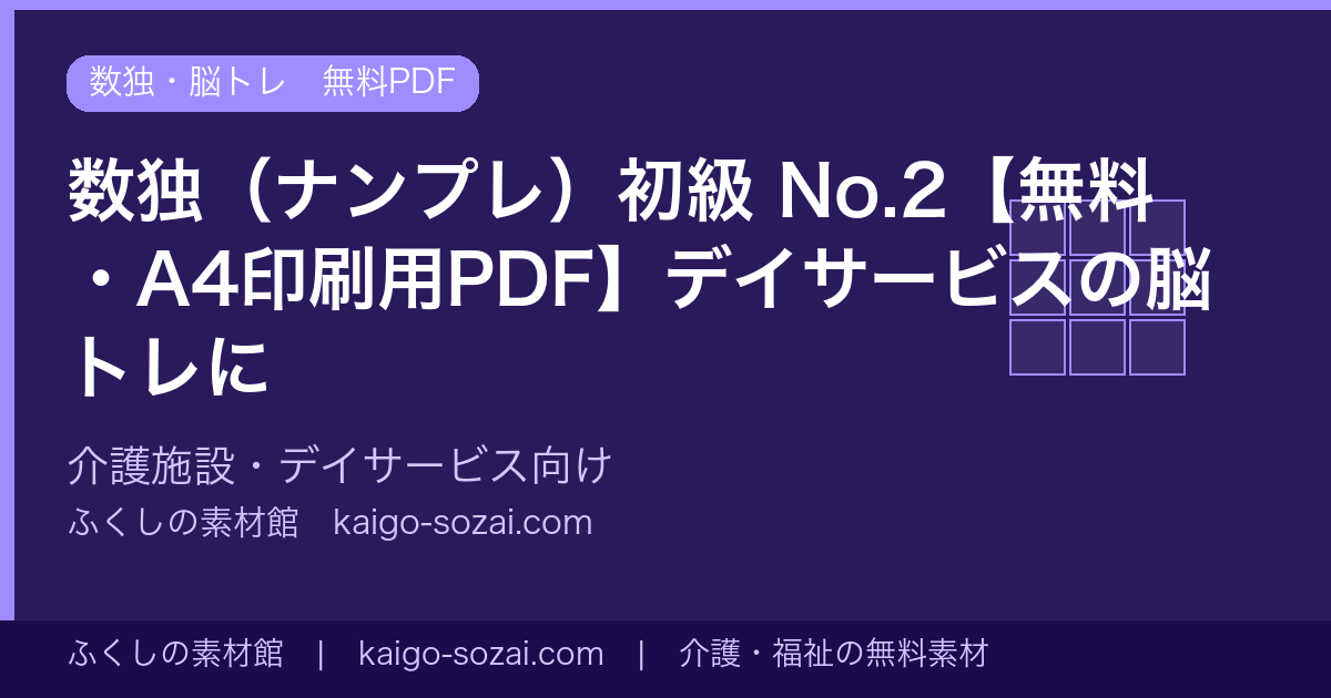 数独(ナンプレ)初級 No.2【無料・A4印刷用PDF】デイサービスの脳トレに