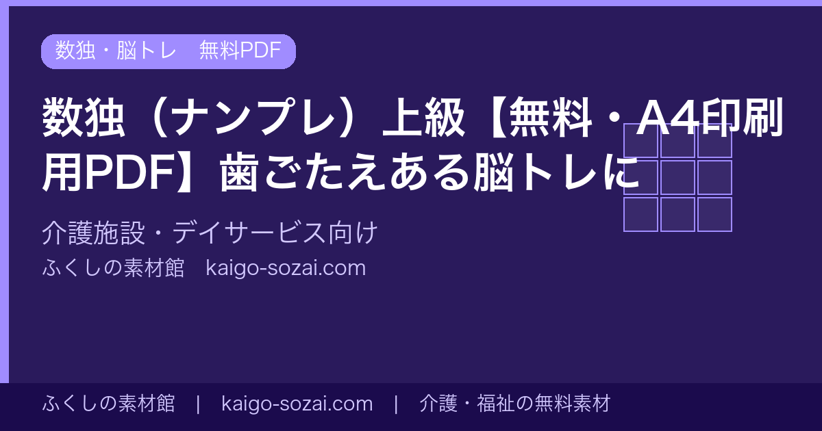 このページの数独プリントはA4サイズで印刷してご利用いただけます。無料・商用利用可能で、デイサービス・介護施設・病院・老健など施設内での配布も自由です。PDFファイルをダウンロードして印刷してください。何枚でも印刷していただけますので、毎週のレクリエーションで継続的にご活用ください。クレジット表記は不要ですが、サイトのURLを紹介していただけると嬉しいです。